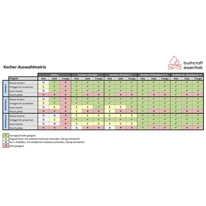 Das Bushbox XL Profi Set lässt keine Wünsche offen und ist der optimale Begleiter für das nächste Abenteuer im Freien. Bestehend aus Camping-Kocher, Universalrost, Topfauflagen und strapazierfähiger Outdoor-Tasche ist in diesem Set alles dabei was man braucht. Die Bushbox XL ist ein sehr effizienter Kocher der im Handumdrehen zusammengefaltet ist und sich somit platzsparend, beispielsweise in der enthaltenen Baumwolltasche, verstauen lässt. Der Outdoor-Kocher ist mit einer Halteposition für Trangia Kocher ausgestattet, es können aber auch Esbit Tabletten eingesetzt werden. Auch mit organischen Brennstoffen wie beispielsweise Holz oder Holzkohle kann der Camping-Kocher betrieben werden. Im Handumdrehen kocht die Bushbox Wasser, erwärmt Fertiggerichte und kann mit Einsatz des Universalrostes sogar als Grill verwendet werden. Unter höchsten Qualitätsansprüchen wird die Bushbox XL sowie auch alle weiteren Artikel von Bushcraft in Deutschland hergestellt. Die Bushbox ist aus rostfreiem Edelstahl gefertigt und somit besonders robust.