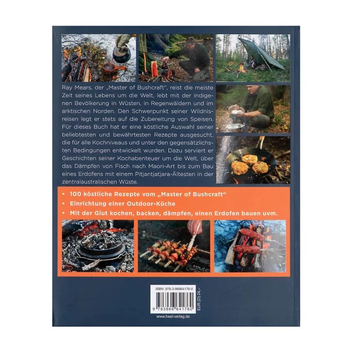 Ray Mears kennt sich aus in Sachen Bushcraft: die meiste Zeit seines Lebens verbrachte er draußen. Er lebte mit der indigenen Bevölkerung in Wüsten, in Regenwäldern und im arktischen Norden. Den Schwerpunkt seiner Wildnisreisen legt er stets auf die Zubereitung von Speisen. Für dieses Buch hat er eine köstliche Auswahl seiner beliebtesten und bewährtesten Rezepte ausgesucht – für alle Kochniveaus. Zu den natürlich immer regionalen Gerichten serviert Mears die Geschichten seiner Kochabenteuer aus der ganzen Welt. Vom Backen eines Geburtstagskuchens mit Zutaten aus dem Regenwald, vom Dämpfen von Fisch nach Maori-Art oder dem Bau eines Erdofens mit einem Pitjantjatjara-Ältesten in der zentralaustralischen Wüste. Die Kochtechniken reichen vom Kochen in der Glut, Dünsten in Moos und Blättern bis hin zum Ei am Stock, den Lachs in der Klemme oder ein ganzes Rippchen am Haken über das Feuer gehängt. Der Autor erklärt, wie man einen Flammlachs auf dem selbstgeschnitzten Holzbrett gart oder improvisierte Grills in der Wildnis herstellt. Auch das Braten in der Pfanne auf dem Lagerfeuer braucht etwas Übung. Mit den köstlichen Rezepten und Anleitungen von Ray Mears macht das Braten auf dem offenen Feuer richtig Spaß. Und auch das Kochen von Kaffee, Tee, Reis oder Nudeln gelingt mit den Tipps in diesem Buch viel besser!
