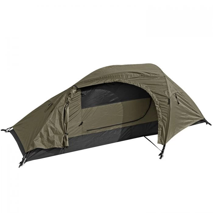 Das Recom Einmannzelt von Mil-Tec punktet vor allem durch seine kompakte, wind- und sturmsichere Form. Der großzügige Eingangsbereich sorgt für ein bequemes Ein- und Aussteigen. Ein Vorraum am Zelt bietet dir zudem das Verstauen und Abstellen von Ausrüstung. Lüftungsöffnungen rechts und links sorgen für eine gute Belüftung, ein Moskitonetz im Eingangsbereich schützt zuverlässig vor dem Eindringen von Insekten und Co.