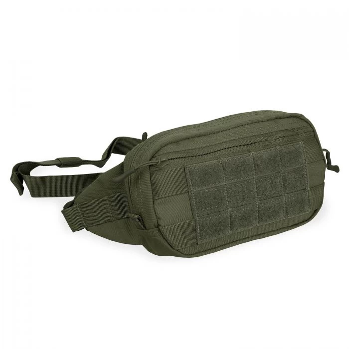 Die Bauchtasche besitzt auf Vorder- und Rückseite jeweils eine flaches Reißverschlussfach sowie zusätzliche MOLLE-Schlaufen auf der Front, die eine Erweiterung mit zusätzlicher Ausrüstung ermöglichen. Zudem ist das Reißverschluss-Hauptfach mit einem Netzfach und breiten Elastikschlaufen versehen, die das Hauptfach in zwei Bereiche aufteilt. Auf Der verstellbare Hüftgurt wird mittels Steckverschlüssen an der Gürteltasche befestigt.
