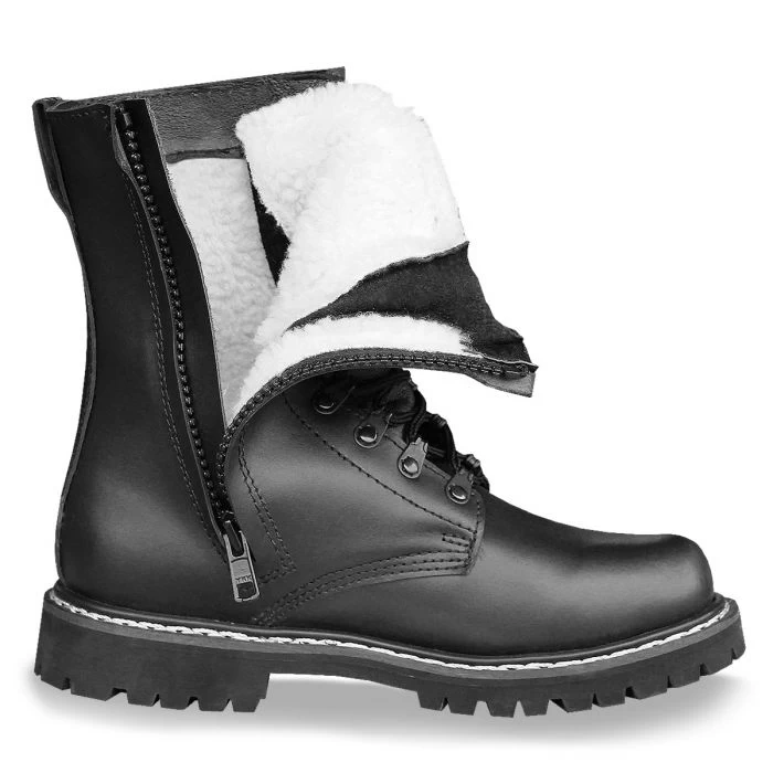 Warm gefütterter Pilotenstiefel, mit 9-Loch Schnellschnürsystem, verschweißten Nähten und neuer, ölresistenter Sohlenkonstruktion. Der Reißverschluss an der Innenseite ermöglicht ein schnelleres und bequemeres An- und Ausziehen. Das Innenfutter besteht komplett aus Kunstfell und hält den Fuß schön warm. Obermaterial: 100% Rindleder, Innenmaterial: Kunstfell, Sohle: Gummi. Schafthöhe: ca. 24,5 cm.