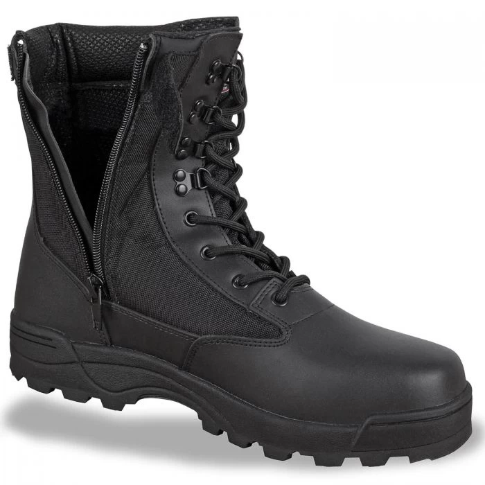 Taktisch, praktisch, gut – der SWAT Boots Zipper von bw-online-shop ist ein Outdoorstiefel mit besten Eigenschaften. Die 8-Loch-Schnürung mit Leichtlaufösen und der seitliche Reißverschluss machen das An- und Ausziehen einfach und bequem. Der gepolsterte Schaftabschluss sorgt für einen festen Stand, die ebenfalls gepolsterte Zunge macht das Tragen komfortabler. Die Kombination aus Leder und Cordura machen die Stiefel absolut robust, sowie abrieb- und reißfest. Außerdem besitzen sie einen verstärkten Fersen- und Zehenbereich und eine rutschfeste Synthetiksohle. Der hohe Schaft bietet stabilen Halt auf unwegsamen Gelände.